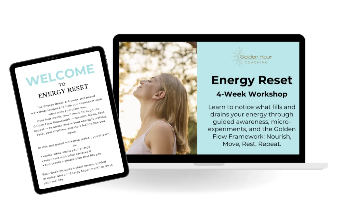 In this self-paced workshop, you’ll use the Golden Flow Framework™ — Nourish, Move, Rest, Repeat — to uncover where your energy is going and how to get it flowing again.